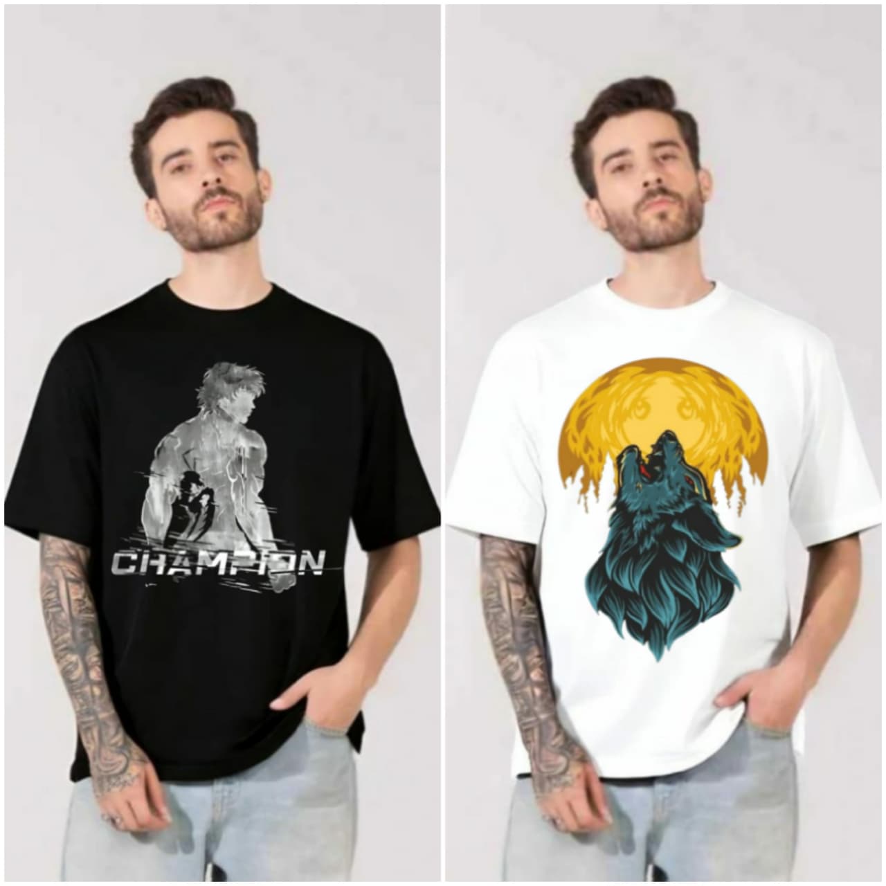 220 GSM Bio Washed and Enzyme Washed 100% Cotton Combo Of 2 Printed Mens Oversized ,  best matching with Jeans
