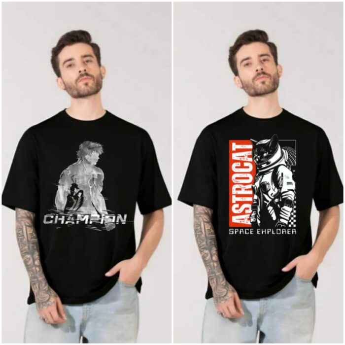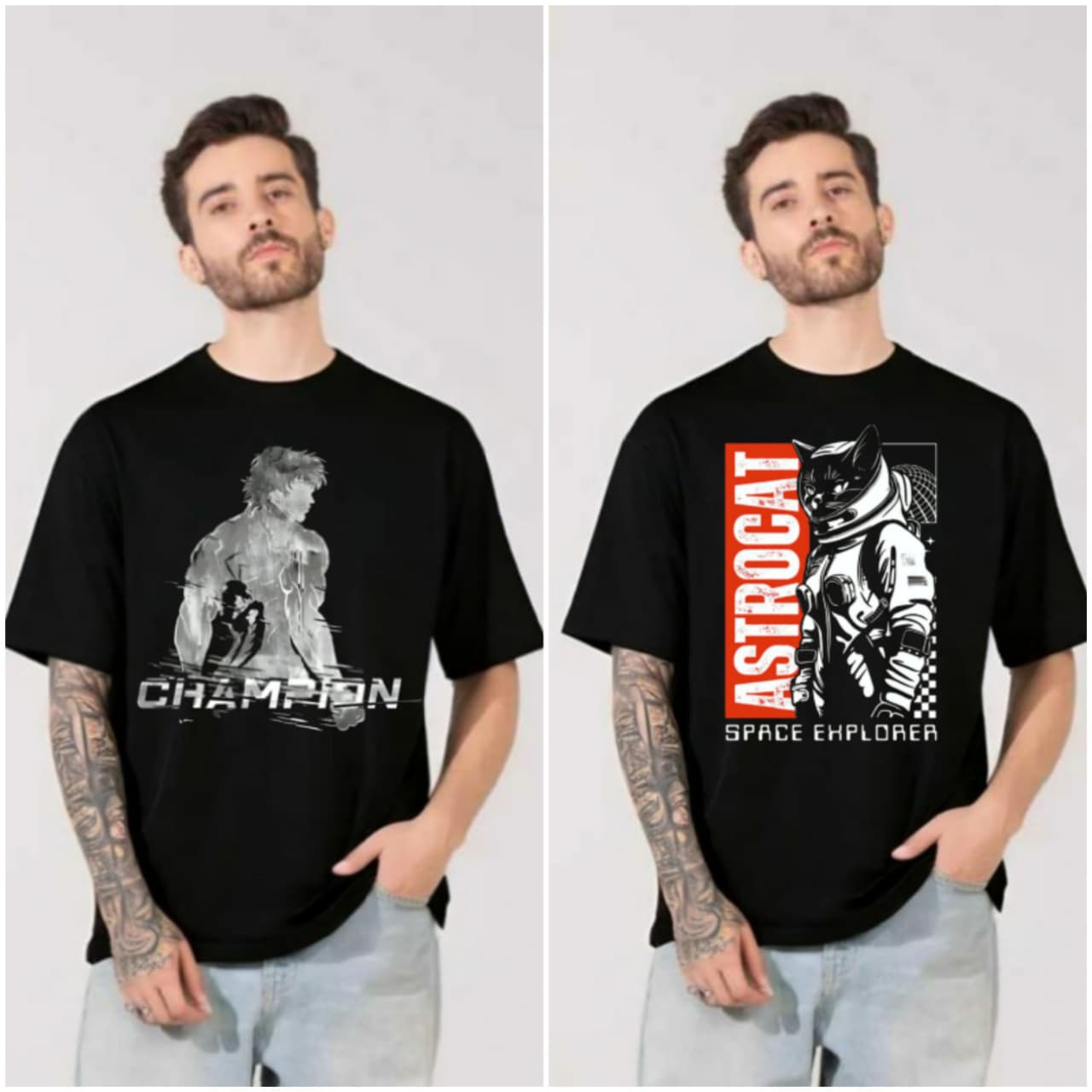 220 GSM Bio Washed and Enzyme Washed 100% Cotton Combo Of 2 Printed Mens Oversized ,  best matching with Jeans Trousers in casual wear.