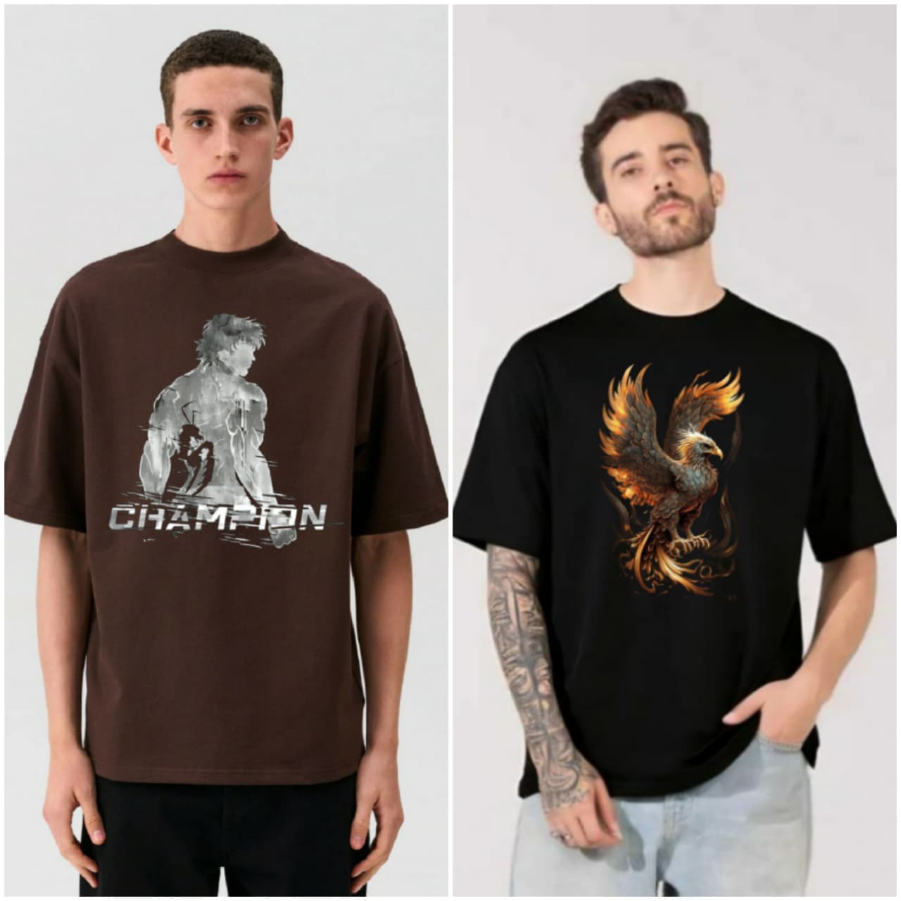 220 GSM Bio Washed and Enzyme Washed 100% Cotton Combo Of 2 Printed Mens Oversized ,  best matching with Jeans Trousers in casual wear.