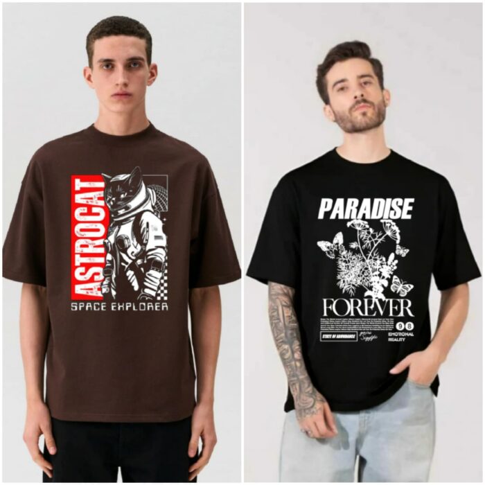 220 GSM Bio Washed and Enzyme Washed 100% Cotton Combo Of 2 Printed Mens Oversized ,  best matching with Jeans Trousers in casual wear.