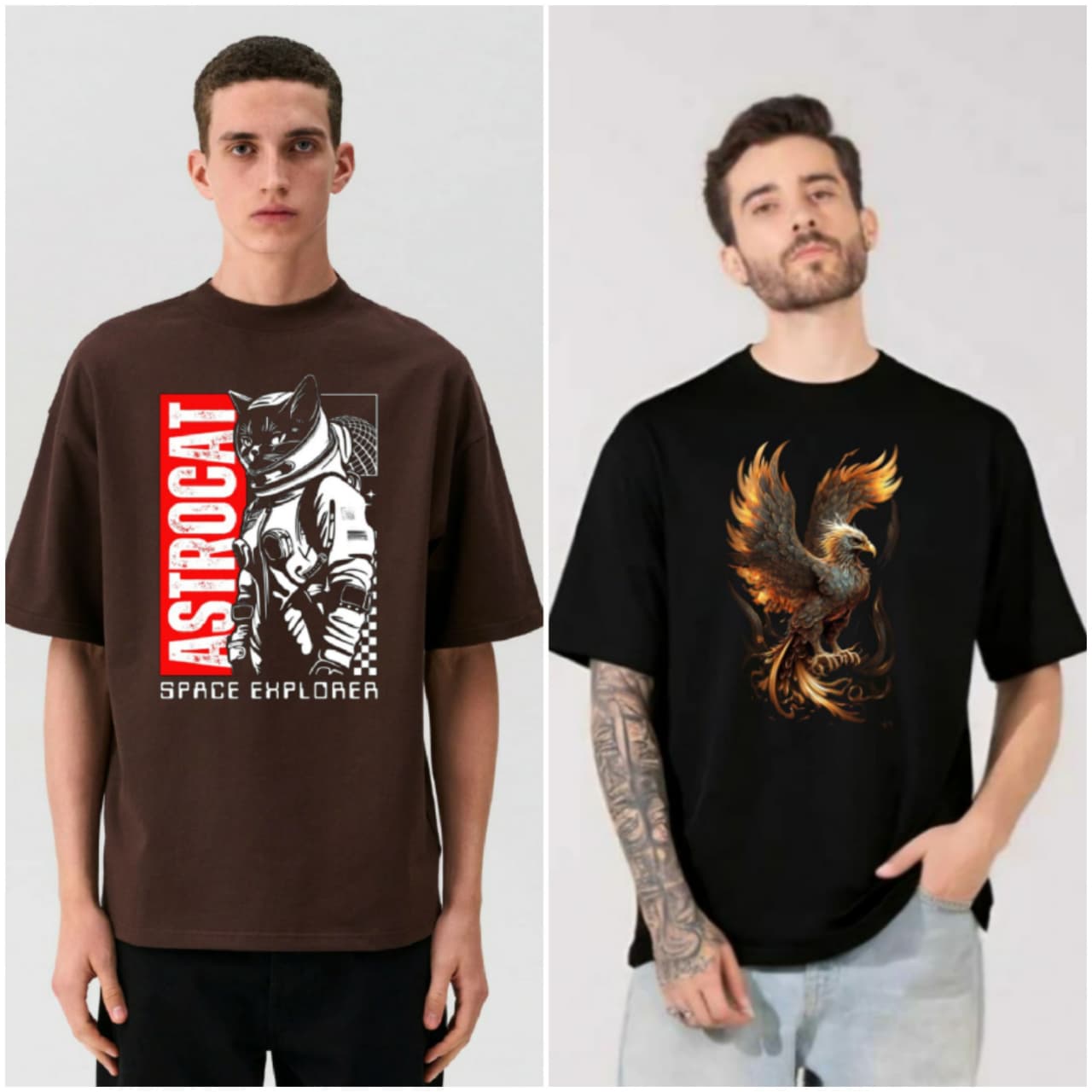 220 GSM Bio Washed and Enzyme Washed 100% Cotton Combo Of 2 Printed Mens Oversized ,  best matching with Jeans Trousers in casual wear