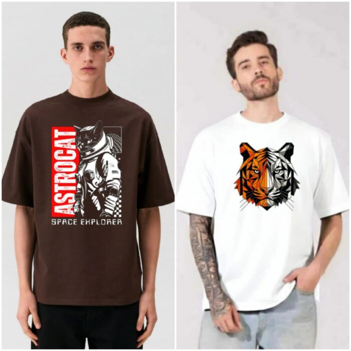 220 GSM Bio Washed and Enzyme Washed 100% Cotton Combo Of 2 Printed Mens Oversized ,  best matching with Jeans Trousers in casual wear.