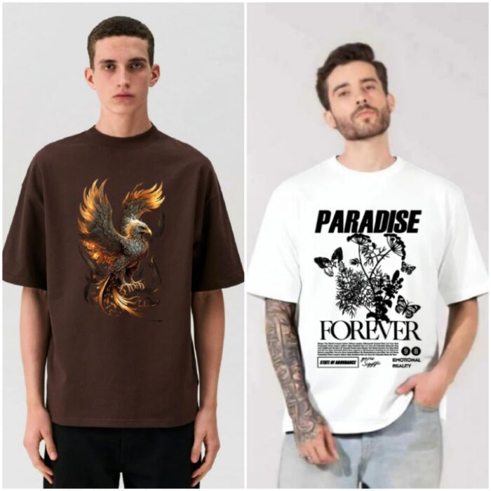 220 GSM Bio Washed and Enzyme Washed 100% Cotton Combo Of 2 Printed Mens Oversized ,  best matching with Jeans Trousers in casual wear.