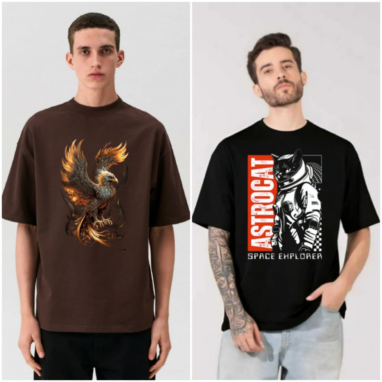 220 GSM Bio Washed and Enzyme Washed 100% Cotton Combo Of 2 Printed Mens Oversized ,  best matching with Jeans Trousers in casual wear.