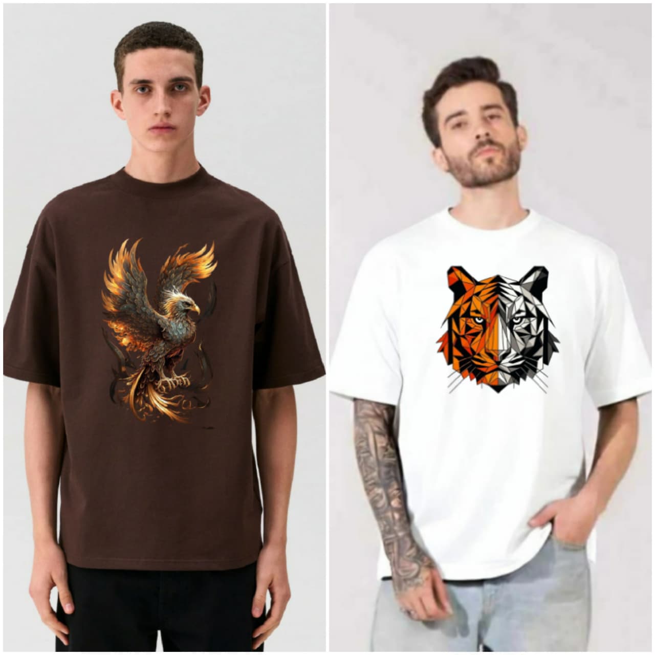 220 GSM Bio Washed and Enzyme Washed 100% Cotton Combo Of 2 Printed Mens Oversized ,  best matching with Jeans Trousers in casual wear.