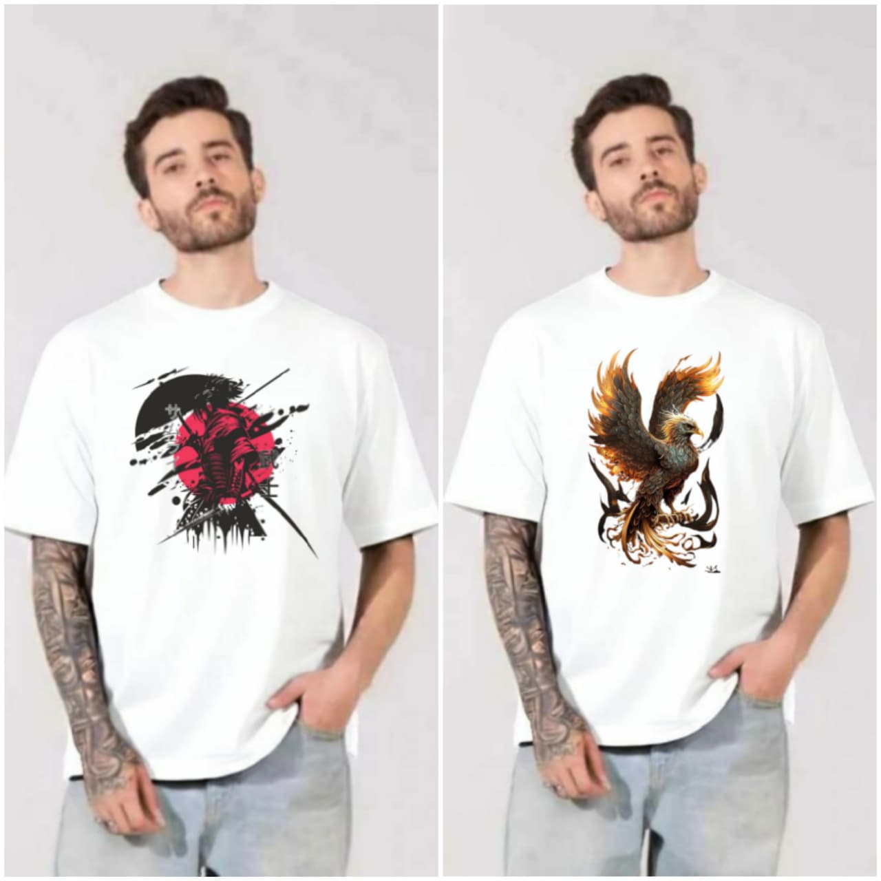 220 GSM Bio Washed and Enzyme Washed 100% Cotton Combo Of 2 Printed Mens Oversized ,  best matching with Jeans Trousers in casual wear.