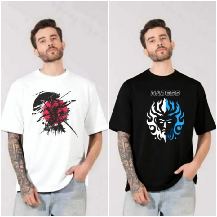 220 GSM Bio Washed and Enzyme Washed 100% Cotton Combo Of 2 Printed Mens Oversized ,  best matching with Jeans Trousers in casual wear.