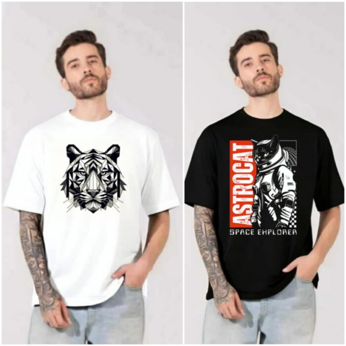 220 GSM Bio Washed and Enzyme Washed 100% Cotton Combo Of 2 Printed Mens Oversized ,  best matching with Jeans Trousers in casual wear.