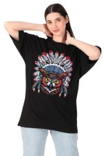 220 GSM Bio Washed and Enzyme washed 100% Cotton Oversized Owl printed Ladies T-shirt, best matching with Jeans Trousers in casual wear.