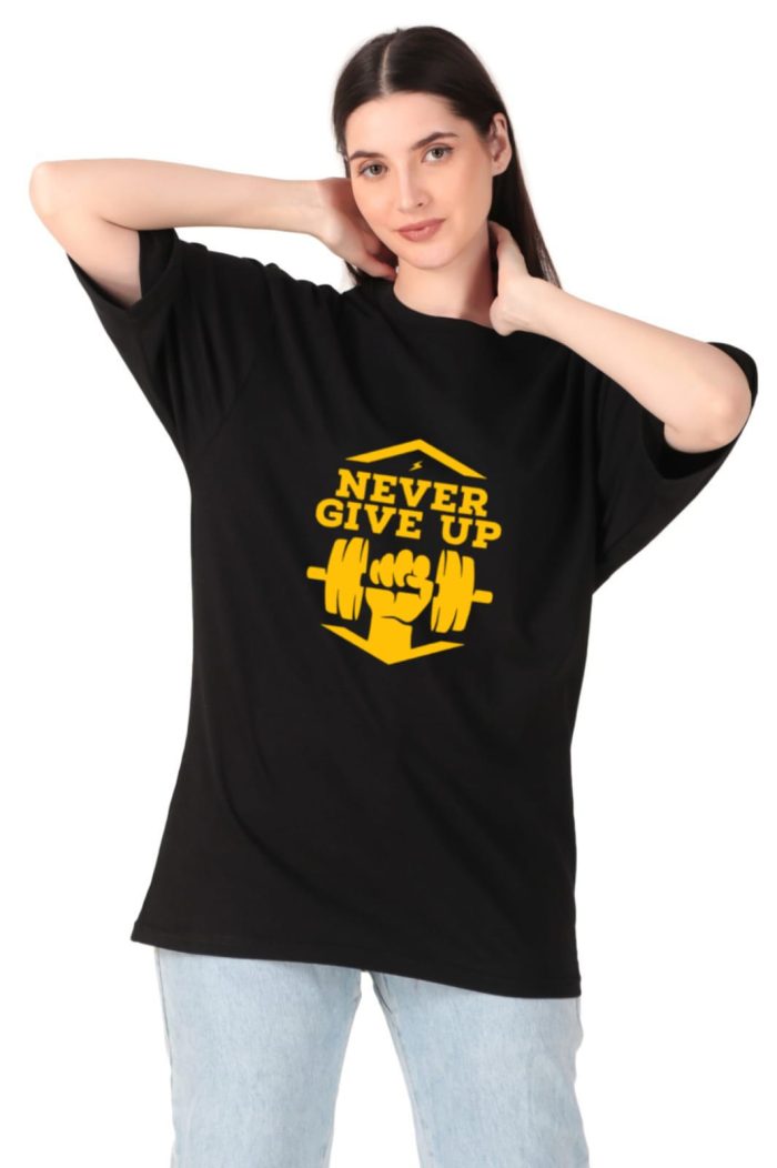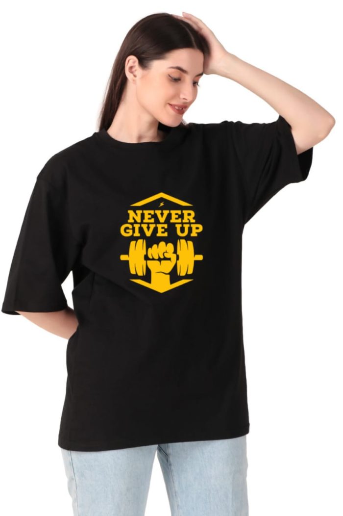 220 GSM Bio Washed and Enzyme washed  100% Cotton Oversized Never Give Up printed Ladies T-shirt, , best matching with Jeans Trousers in casual wear.