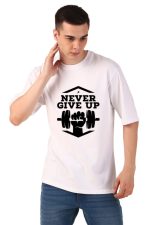 220 GSM Bio Washed and Enzyme washed 100% Cotton Oversized Never Give Up printed men’s T-shirt, best matching with Jeans Trousers in casual wear.