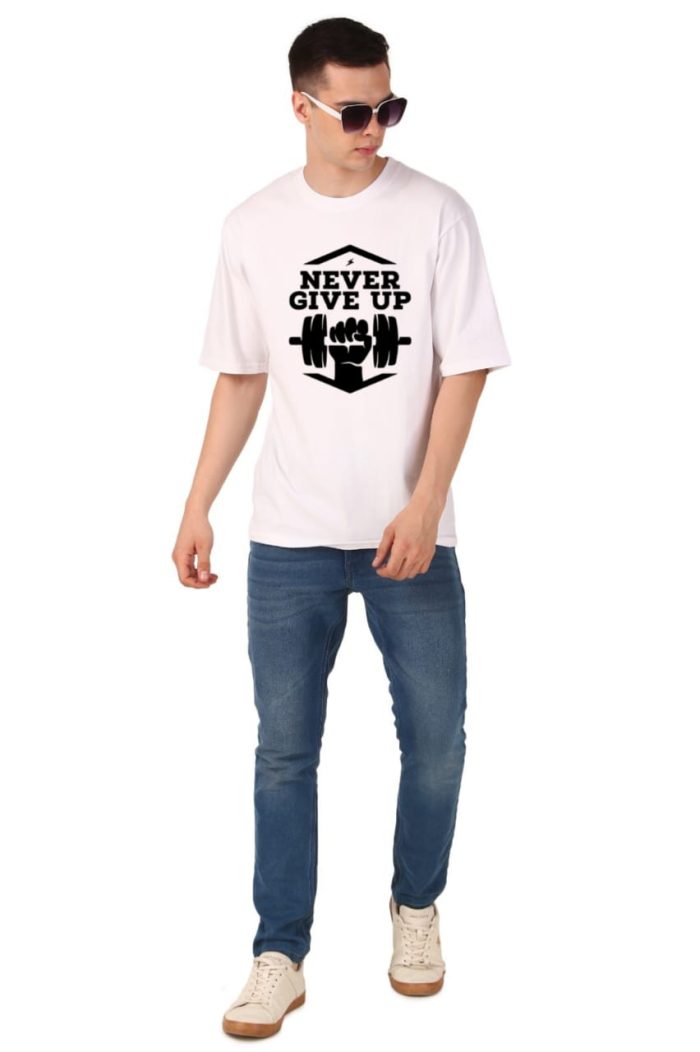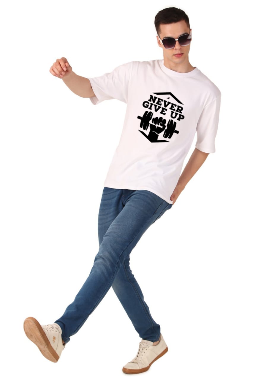 220 GSM Bio Washed and Enzyme washed 100% Cotton Oversized Never Give Up printed men’s T-shirt, best matching with Jeans Trousers in casual wear.