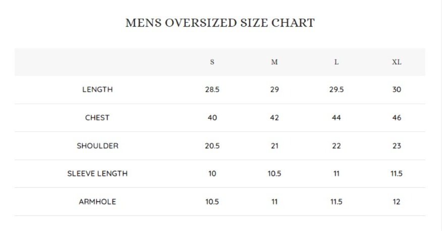 MENS OVERSIZED SIZE CHART