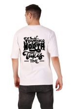 220 GSM Bio Washed and Enzyme washed 100% Cotton Oversized Anythink Worth Having Takes Time printed men’s T-shirt, best matching with Jeans Trousers in casual wear.